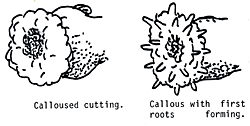 Callus is the white tissue that forms on cut surfaces of the cutting, and can also appear in lines along the sides of the cutting. It is from callus that roots form. (See Fig 3 & 4).
